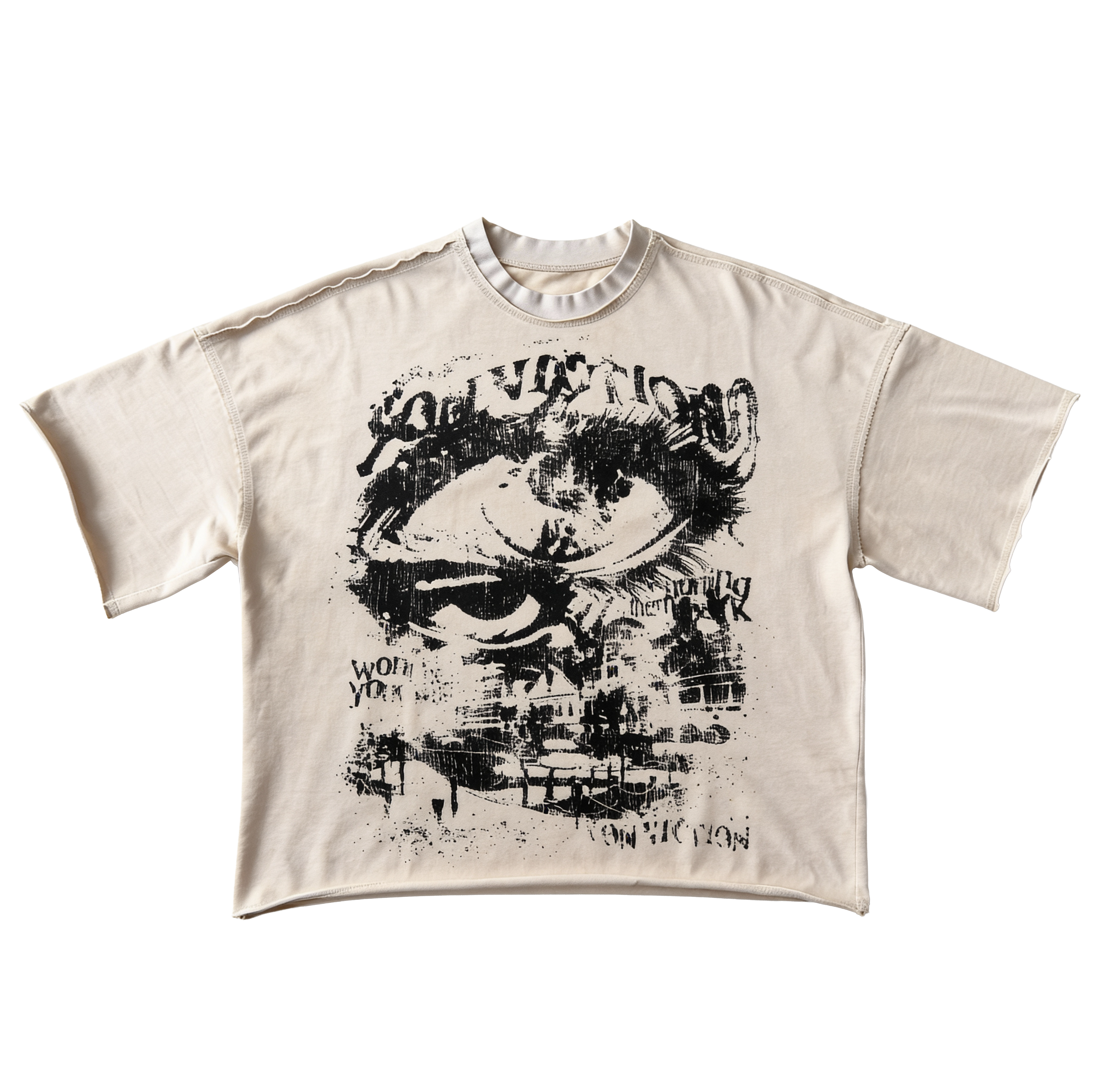 Cut from 300gsm 100% organic French terry cotton, this piece balances weight and breathability with a naturally substantial hand feel. The silhouette is boxy with a subtle crop, designed to sit clean on the body without clinging or over-extending.